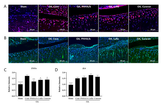 Immunofluorescence staining to assess inflammatory cytokines, including TNFα, IL6, and IL1β, revealed increased TNFα (Figure 4A,C) and IL6 (Figure 4B,D) levels in the medial tibia region of an OA animal model, while IL1β showed a slight decrease (Supplementary Figure S2A,B). PNHA/b, Cureran, and Lufla demonstrated a reduction in TNFα levels, with no observable effect on IL6. When the staining intensity in the medial tibial region was quantified, it was found that despite the trend that PNHA/b may be more effective in reducing TNFα expression than Cureran and Lufla, the difference did not reach statistical significance (Figure 4C).