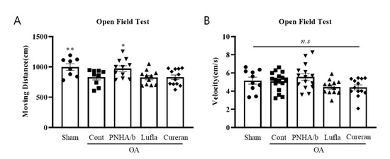 Unlike the grade-4 OA model (Figure 2), the mild grade-2 OA model exhibited a decrease in the moving distance, while the velocity remained comparable to that in the sham controls (Figure 5A,B). PNHA/b, Cureran, and Lufla demonstrated anti-inflammatory effects by reducing the amount of TNFα. However, when the locomotor activity was assessed through the OFT, the moving distance significantly improved only in the PNHA/b group, reaching a level comparable to that of the sham group (Figure 5A).