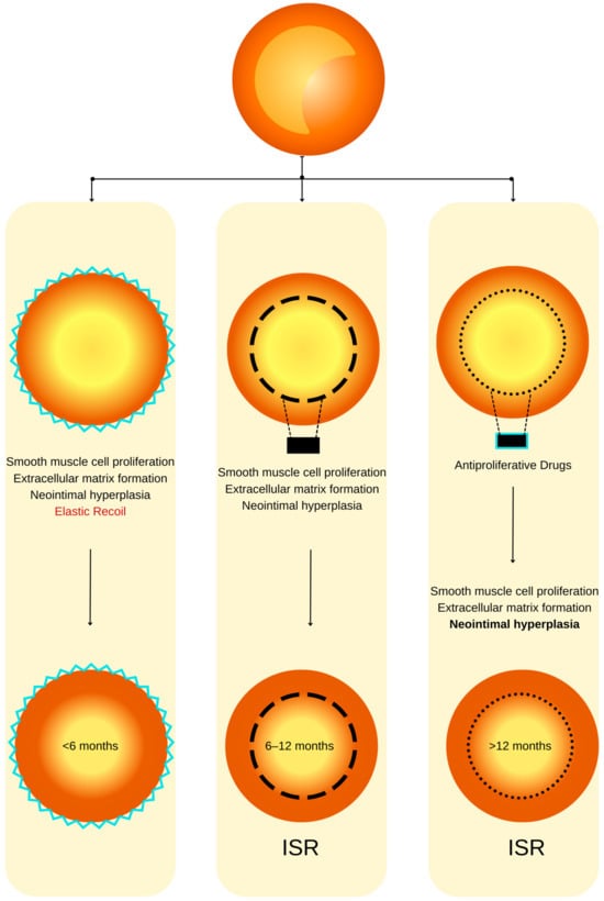ISR physiopathology (adapted from an open–access source [32]). (Left): Coronary restenosis after conventional balloon angioplasty primarily arises from the phenomenon of elastic recoil of the arterial vessel wall. Moreover, the trauma inflicted on the coronary artery triggers the initiation of smooth muscle cell proliferation, their migration, and the deposition of an extracellular matrix. This cascade of events culminates in the formation of neointimal hyperplasia, which ultimately contributes to the pathogenesis of restenosis. (Center): The deployment of a BMS is associated with a heightened level of vascular injury, thereby augmenting the magnitude of neointimal hyperplasia and elevating the risk of in-stent restenosis. (Right): DESs dispense antiproliferative agents, effectively mitigating the extent of neointimal hyperplasia and correspondingly diminishing the susceptibility to in-stent restenosis.