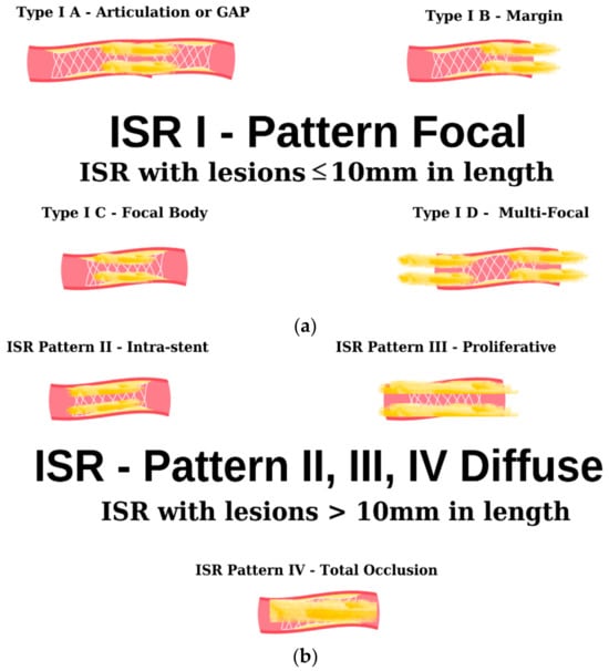 As evidenced by the existing literature, the deployment of a stent in a vessel elicits a localized inflammatory response. This inflammatory cascade constitutes a pivotal component in the genesis of a pathological phenomenon recognized as ISR [64]. Furthermore, the intricacies of this multifaceted phenomenon extend beyond the mere presence of a stent, encompassing an array of stent-dependent, intra-stent, and extra-stent risk factors. The schematic delineation portrayed in Figure 3 illustrates the angiographic patterns under discussion. It is imperative to underscore that this classification holds pivotal significance in prognosis and expeditious patient triage for both clinical and investigative objectives [65].
