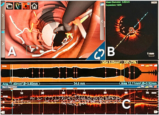 ISR manifests through a complex interplay of diverse mechanical and biological elements, encompassing drug resistance and hypersensitivity reactions to drug polymers [10]. This challenge’s intricate nature necessitates identifying and modifying underlying causative factors. Employing intravascular imaging methods, such as optical coherence tomography (OCT) (Figure 4), or intravascular ultrasound (IVUS), offers a promising avenue for delineating mechanistic intricacies and potentially mitigating the condition [73]. These imaging modalities have notably contributed to elucidating the correlation between specific lesion characteristics and the predisposition to ISR [74]. Nonetheless, the current body of evidence remains insufficient to substantiate the efficacy of intravascular imaging in improving clinical outcomes or forestalling recurrent episodes of ISR [73].