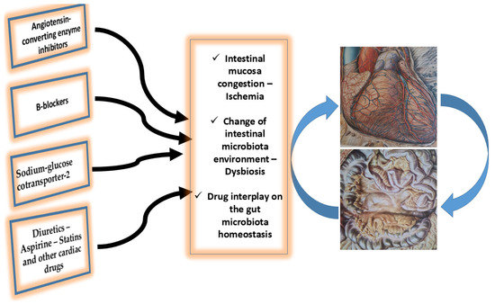 Heart failure is a complex syndrome, and several factors must be taken into account in order to better understand the cardiac oral drugs–gut microbiota interplay. For example, this interplay in stable patients with recommended therapy could be different from that in patients with advanced or refractory heart failure, which is obviously due to the different stage of mucosa ischemia/congestion and to the imbalance of the intestinal microbial homeostatic environment, the so-called dysbiosis. Ischemia and/or congestion alter intestinal mucosa permeability, the intestinal barrier function is reduced, and the drug–microbiota interplay becomes abnormal. Additionally, several other organs (kidneys, endothelium, liver, etc.) are at play, as the syndrome progresses to a more severe situation. In this respect, right-side heart dysfunction could lead to the congestion of several organs including kidneys, body swelling, gut mucosa, etc., due to the increased venous pressure observed in this type of heart failure. Thus, a vicious circle arises consisting of the interplay among reduced right-heart function, renal dysfunction, endothelial dysfunction, altered gut mucosa barrier permeability, etc. This is an interplay that could alter the orally administrated cardiac drugs’ action, changing the drug bio-viability and absorption. Additionally, as the syndrome aggravates patients with heart failure may demonstrate abdominal discomfort, lack of appetite, alteration of several hormones including growth hormone, leptin, etc., leading to a negative imbalance between anabolic and catabolic metabolism and hence cachexia. A situation that alters the cardiac drugs–microbiota interplay [110].