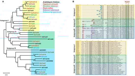 While studies on Trx in various crops exist, research on the Trxh family in peppers is still lacking. Therefore, we first identified the Trxh-type family in peppers. Putative hot pepper Trxh-type members were identified using BLAST searches against the genome sequence for hot pepper C. annuum cv. CM334 and Zunla-1 (Table 1). We found seven CaTrxh-type genes through pepper genome analysis. The Trx domain structure is annotated by SMART (http://smart.embl-heidelberg.de/smart/batch.pl, accessed on 1 January 2023). The molecular weights and theoretical isoelectric points of each CaTrxh-type protein were analyzed using ExPASy (https://www.expasy.org/, accessed on 1 January 2023) (Table 2). From the identification data, we identified seven CaTrxh-type members. To confirm the phylogenetic relationship between Arabidopsis AtTrxh, which is well known for its function, and other important crop plants, a phylogenetic tree was constructed for the Trxh-type protein sequence. As shown in Figure 1A, CaTrxh family proteins were divided into three subgroups according to the classification of AtTrxh. OsTrxh4, OsTrxh5, OsTrxh7, and OsTrxh8 are considered redundant types. These results indicate that the functional and evolutionary properties of CaTrxh present in Solanaceae crops may be similar.