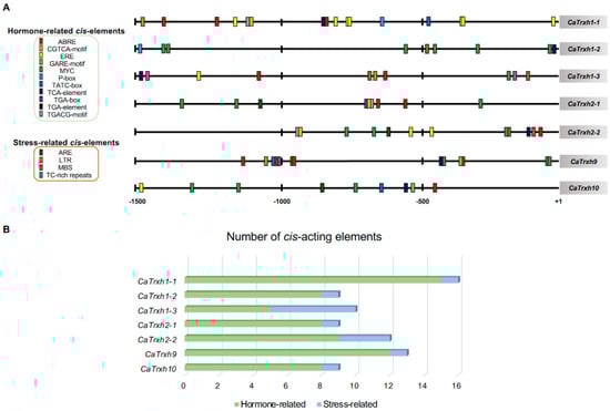 Promoter analysis of CaTrxh-type genes. (A,B) The 1.5 kb promoter of CaTRX h-type genes was analyzed via PlantCARE. Important plant hormone-related motifs and stress-related motifs were placed in the promoters using various shapes.