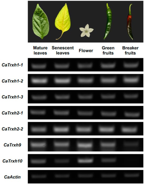 To gain further insight into the development and functional role of CaTrxh-type in each tissue, the expression pattern of CaTrxh-type was investigated via semi-quantitative RT-PCR. Gene expression of the CaTrxh-type family was confirmed in mature leaves (ML), senescent leaves (SL), flower (F), green fruit (GF), and breaker fruit (BF). All CaTrxh types was expressed in ML, SL, F, GF, and BF. CaTrxh1-1, CaTrxh1-2, CaTrxh1-3, CaTrxh2-1, and CaTrxh2-2 showed little change in expression levels; whereas subgroup III CaTrxh9 and CaTrxh10 showed reduced gene expression levels in BF (Figure 3). For CaTrxh10, gene expression is reduced in SL compared to ML. Thus, some CaTrxh genes are expected to affect developmental processes.