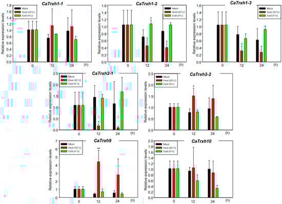 Analysis of gene expression patterns of the CaTrxh family under low- and high-temperature stress. Peppers grown for 4 weeks were exposed to stress at 4 °C and 42 °C for 12 h and 24 h, respectively, and gene expression was tested by qRT-PCR. The CaAct gene was used as a control. Error bars indicate the standard deviations of three independent qRT-PCR biological replicates. Asterisks indicate significant differences from the control using the unpaired Student’s t-test (* p < 0.05 and ** p < 0.01).