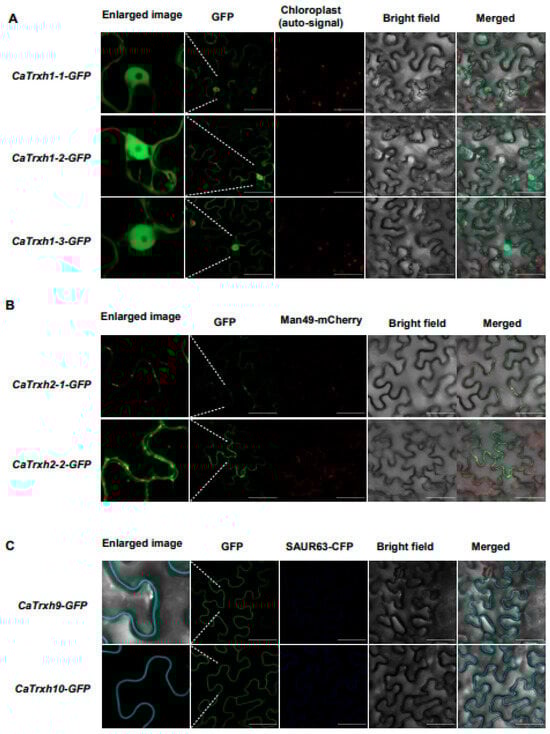 Analysis of various subcellular localizations of the CaTrxh-type family. Each CaTrxh gene was cloned into a 35S::GFP vector (C-terminal GFP fusion), and Agrobacterium-mediated transient assay was performed in N. benthamiana. After infiltration, the GFP signal was checked using a confocal microscope. (A) Subcellular localization of subgroup I members: CaTrxh1-1-GFP, CaTrxh1-2-GFP, and CaTrxh1-3-GFP. The GFP signal of a member of group I was merged with the chloroplast auto-signal (Red). (B) Subcellular localization of subgroup II members: CaTrxh2-1-GFP and CaTrxh2-2-GFP. The GFP signal of a member of group II was merged with Man49-mCherry, a Golgi marker. (C) Subcellular localization of subgroup III members: CaTrxh9-GFP and CaTrxh10-GFP. The GFP signal of group III member was merged with SAUR63-CFP, a plasma membrane marker. Scale bar: 50 µm.