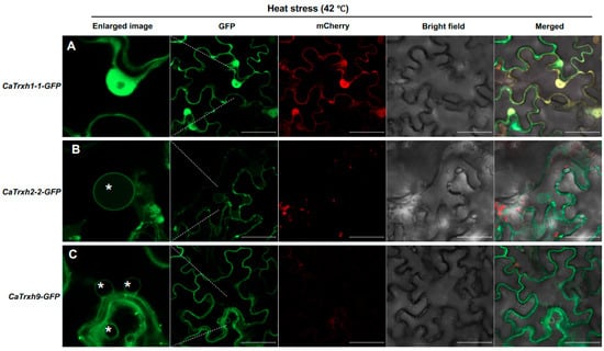 CaTrxh-type proteins undergo changes in their subcellular localization in response to heat stress. (A–C) 35S::CaTrxh1-1-GFP, 35S::CaTrxh2-2-GFP, and 35S::CaTrxh9-GFP were transiently expressed in N. benthamiana leaves for 3 days. The plants were then incubated at 42 °C for 1 h to examine their subcellular localization. 35S::mCherry vector used as a negative control upon the heat stress. The asterisk indicates the tonoplast. Scale bar: 50 µm.