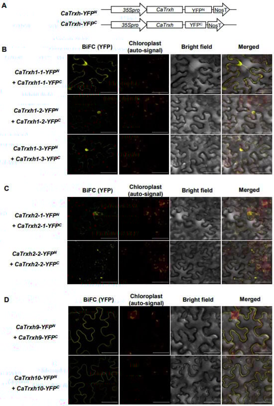 All CaTrxh-type proteins form homodimers in BiFC assay. (A) Construction of split-YFP. (B) In group I, members were observed to have homodimer interactions in the BiFC assy. Reconstituted YFP signals were observed in the combinations of CaTrxh1-1-YFPN/CaTrxh1-1-YFPC or CaTrxh1-2-YFPN/CaTrxh1-2-YFPC or CaTrxh1-3-YFPN/CaTrxh1-3-YFPC. BiFC analysis was performed on an Agrobacterium-mediated transient gene expression system. (C) In group II, CaTrxh2-1-YFPN and CaTrxh2-1-YFPC or CaTrxh2-2-YFPN and CaTrxh2-2-YFPC constructs were coexpressed in N. benthamiana. These CaTrxh group II showed YFP fluorescence. (D) In group III, CaTrxh9-YFPN and CaTrxh9-YFPC or CaTrxh10-YFPN and CaTrxh10-YFPC constructs were coexpressed in N. benthamiana. Scale bar: 50 µm.