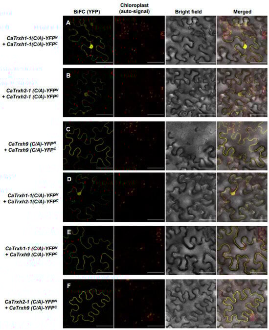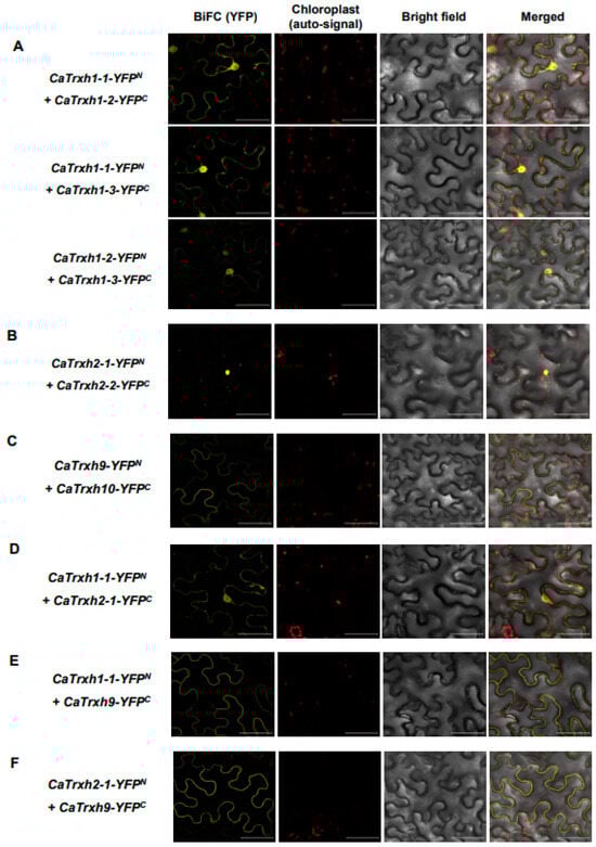 All CaTrxh-type proteins make heterodimers in BiFC assay. (A) In group I, CaTrxh protein make a heteromeric complex in BiFC. The CaTrxh1-1-YFPN/CaTrxh1-2-YFPC or CaTrxh1-1-YFPN/CaTrxh1-3-YFPC or CaTrxh1-2-YFPN/CaTrxh1-3-YFPC combinations were transiently expressed in tobacco leaves. (B) In group II, CaTrxh2-1-YFPN and CaTrxh2-2-YFPC constructs were coexpressed in N. benthamiana. (C) In group III, CaTrxh9-YFPN and CaTrxh10-YFPC constructs were coexpressed in N. benthamiana. (D) In group I and group II combinations, CaTrxh1-1-YFPN and CaTrxh2-1-YFPC constructs showed reconstructed YFP signal when coexpressed. (E). In group I and group III combinations, CaTrxh1-1-YFPN and CaTrxh9-YFPC constructs were coexpressed and YFP signal was observed. (F). In group II and group III combinations, CaTrxh2-1-YFPN and CaTrxh9-YFPC constructs were coexpressed. Scale bar: 50 µm.