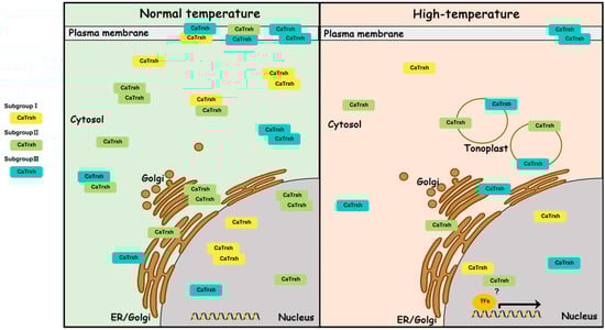 Many members of the Trxh-type gene family and their diverse subcellular locations may be closely related to their functions. The most effective approach to engineering crops to overcome climate change is to adopt methods that enhance tolerance to oxidative stress []. In this study, we identified seven CaTrxh-types genes and confirmed that CaTrxh-type genes respond to abiotic stress. We also found that CaTrxh proteins were present at specific subcellular locations in plant cells and that their locations changed in response to heat stress (Figure 4). It is necessary to make transgenic plants using the CaTrxh gene and to test what kind of phenotype they have in response to high-temperature stress. CaTrxh-type genes may have a useful high-temperature tolerance phenotype.