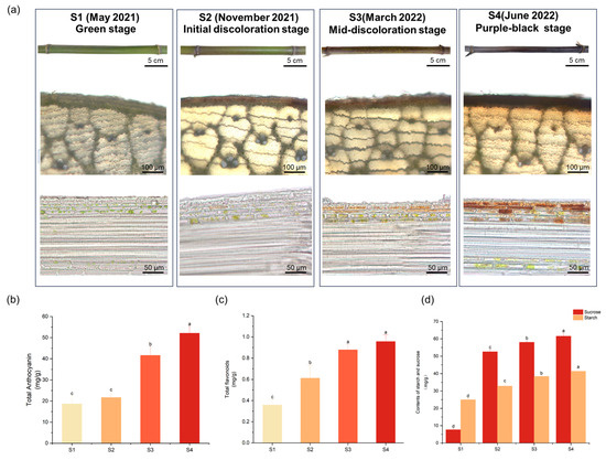 We conducted dynamic monitoring of the color changes of Ph. nigra culms from May 2021 to June 2022. Based on the observed dynamic changes in the culm coloring process, we selected four represented stages, including the green stage (S1), the stage in which culm pigmentation spots began to appear (S2), the stage in which culm pigmentation spots appeared in large quantities (S3), and the stage in which the culm was purple-black (S4), for further anatomical analysis. Observation of the transverse sections of culms showed that Ph. nigra exhibited aggregates of pigment in one to four layers of cells below the epidermis (Figure 1a). As Ph. nigra developed, the total levels of anthocyanins showed an upward trend. Even in the green stage, although there were small amounts of anthocyanins in the culm, it still exhibited a green phenotype (Figure 1b). Likewise, the total flavonoid content showed a gradual increase, following a pattern similar to that of the total anthocyanin content (Figure 1c). Furthermore, the content of sucrose and starch exhibited a gradual increase throughout the four stages, with significant differences between them (Figure 1d).