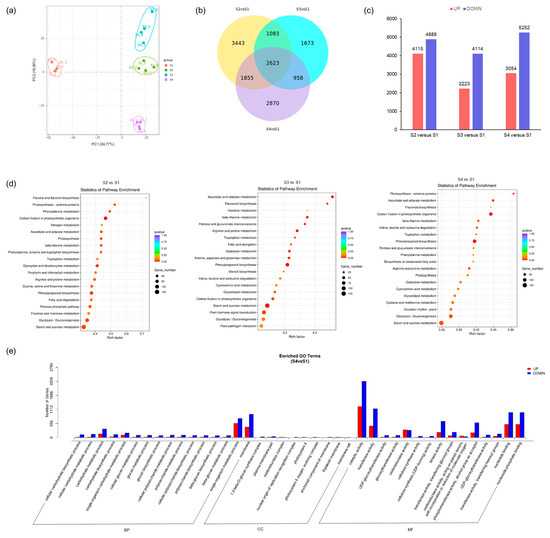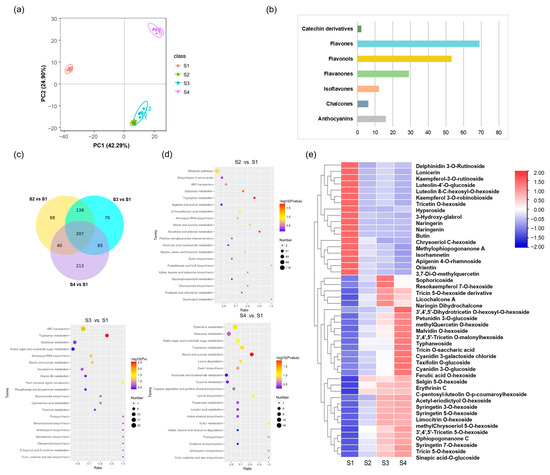 Differentially accumulated metabolites analysis of metabolome. (a) PCA score plot. (b) Detailed classification of flavonoid metabolites. (c) Venn diagram of DAMs. (d) KEGG enrichment of DAMs in each comparison group. (e) The heatmaps of DAMs are in S4-vs.-S1 and S3-vs.-S1.
