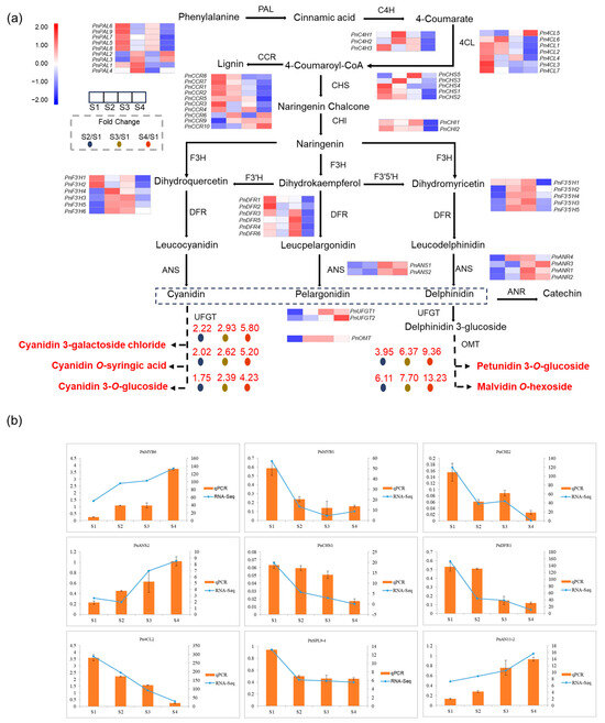 In short, the expression pattern of these structural genes likely contributes to the purple-black coloring of Ph. nigra. The results showed that the expression trend of differentially accumulated flavonoids was consistent with the associated genes. To ensure the reliability of the transcriptome sequencing data, we conducted qRT-PCR detection on essential genes (Table S3). The results of qRT-PCR were in agreement with the transcriptome sequencing analysis, suggesting the reliability of transcriptome analysis for identifying DEGs (Figure 4b).