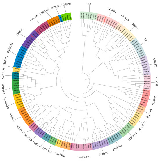 Arabidopsis MYB and bHLH sequences were obtained from TAIR (The Arabidopsis Information Resource, https://www.arabidopsis.org/ accessed on 16 May 2023) (Table S6). The moso bamboo MYB, which is related to anthocyanin synthesis, was also selected and downloaded based on previous studies [57]. The protein sequences were subjected to multiple sequence comparisons using muscle, followed by phylogenetic tree construction using the Maximum Likelihood (ML) method in MEGA11 (v11.0.10) software.
