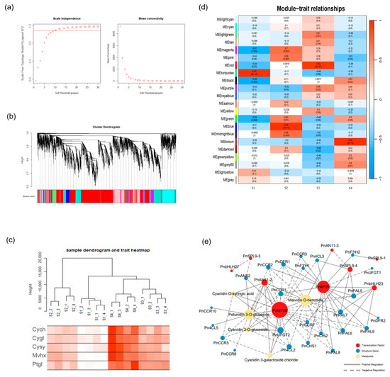 Co-expression network analysis. (a) Soft threshold. (b) Hierarchical cluster tree obtained by weighted gene co-expression network analysis (WGCNA). (c) Sample dendrogram and trait heatmap. petunidin 3-O-glucoside (Ptgl), malvidin O-hexoside (Mvhx), cyanidin O-syringic acid (Cysy), cyanidin 3-O-glucoside (Cygl), and cyanidin 3-galactoside chloride (Cycl). (d) Matrix of module-stages associations. The gray modules represent genes that are not divided into specific modules. (e) Co-expression networks of differentially expressed genes and anthocyanins metabolites associated.