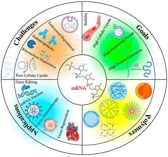 mRNA delivery: Challenges, goals, widely explored polymer-based systems, and intended applications of this technology. Created using BioRender, www.biorender.com (accessed on 12 November 2023).
