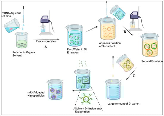 This method, as the name suggests, involves preparing an emulsion in two steps and then evaporating the organic solvent to form nanoparticles (Figure 2). The polymer is dissolved in a water-immiscible, low-boiling solvent (dichloromethane, chloroform, or ethyl acetate) and subsequently mixed with the aqueous phase containing mRNA. The first emulsion is obtained by vigorous stirring or using probe sonication (Step A, Figure 2). It is then added to an aqueous solution containing a surfactant (polyvinyl acetate, vitamin E, tocopheryl polyethylene glycol succinate (TPGS), or various alkylated polyethylene glycol (PEG) chains), which is followed by emulsification to form the second emulsion (Step B). The latter is subsequently added to a large volume of water to induce diffusion of the organic solvent into the aqueous phase (Step C), which is followed by the removal of organic solvent through evaporation [59]. Many parameters can affect the physical properties of the nanoparticles formulated using this method, including emulsion formation, the amplitude of sonicating or stirring, ratio of constituents, and the amount of surfactant used, etc. [60].