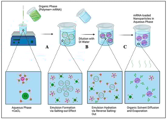 In this method, an emulsion of an aqueous phase and water-miscible organic solvent (acetone or ethanol) is prepared by reducing the solubility of the solute in water by the addition of MgCl2 and CaCl2, which compete with the solute for interactions with water molecules (Figure 3). It involves emulsifying the organic phase containing polymer and mRNA with an aqueous phase which contains a high concentration of the salt. The emulsion is subsequently diluted with distilled water to reverse the salting-out effect. A brief description of this method is presented in Figure 3 as follows: (i) Step A, a solution of the polymer and mRNA in a water-miscible solvent is added dropwise to an aqueous phase containing the desired salt, which is followed by stirring. mRNA is emulsified due to the higher tendency of the water molecules to associate with calcium/magnesium and chloride ions (salting-out); (ii) Step B, the emulsion is subsequently diluted with water to increase the hydration of the mRNA/polymer emulsion (reverse salting-out); (iii) Step C, this leads to the enhanced diffusion of the organic phase into the aqueous phase, which is followed by the evaporation of the organic solvent and formation of mRNA-loaded nanocarriers. The formulated nanoparticles are then purified from the salt solution through filtration [62,63]. Although this technique does not require the use of chlorinated solvents and is appropriate for loading biotherapeutics such as DNA, RNA and proteins, lower encapsulation efficiency of hydrophilic cargo compared with other methods (Table 1) has prevented its widespread use [64,65].