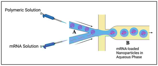 Flash nanocomplexation method: A, mixing of polymer and mRNA solutions through controlled jet streams; B, formation of mRNA-loaded nanoparticles. Created using BioRender, www.biorender.com (accessed on 12 November 2023).