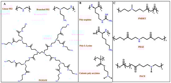 Chemical structures of cationic polymers used for mRNA delivery: (A) linear and branched polyethylene imine (PEI) and polyamidoamine (PAMAM); (B) poly-arginine and poly-l-lysine, and cationic polyacrylates; (C) poly (β-amino esters) (PABE), poly (N-methyl diethanol amine) (PMDET), and poly(amino-co-ester) (PACE).