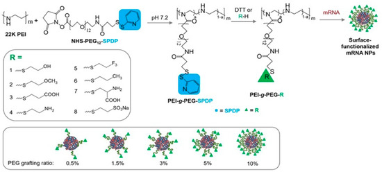 Different end group-functionalized PEG chains grafted on PEI, thus leading to surface-functionalized nanoparticles: synthesis through the grafting of PEG-SPDP onto PEI in varied ratios followed by the exchange of the SPDP group with small, functionalized thiol molecules (R1-R8); self-assembly and loading of mRNA. Reproduced with permission from [70].