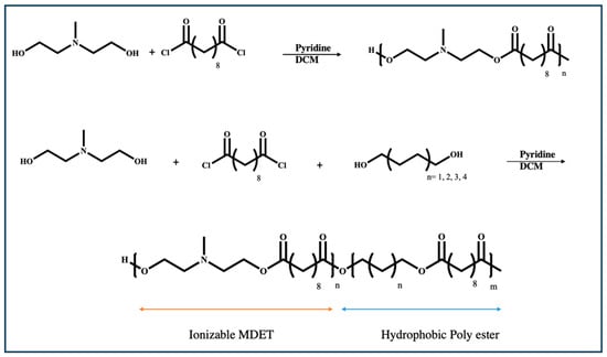 MDET-based polyesters have similar functional groups to those in β-amino esters and additionally contain ionizable amine groups that reduce the need for adjuvants in ester-based biocompatible vectors. Two series of MDET-based polyesters for mRNA delivery have been prepared through the condensation of different alkyl-diols with sebacoyl chloride and N-methyl diethanol amine (Figure 8) [82]. In the first one, N-methyl diethanol amine was reacted with sabacoyl chloride, whereas in the second one, in addition to the aforementioned reagents, alkyl diols with varied chain lengths were introduced into the structure of polyester to impart hydrophobicity to the polymer. This led to the synthesis of a polyester with ionizable MDET and hydrophobic blocks in a one-pot esterification reaction.