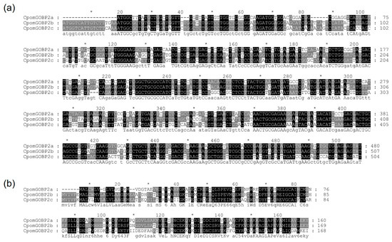 The multiple sequence alignment results of coding sequences showed that the identity between CpomGOBP2a and CpomGOBP2b was 73.75%, the identity between CpomGOBP2b and CpomGOBP2c was 71.43%, and the identity between CpomGOBP2a and CpomGOBP2c was 60.17% (Figure 1a). The identities of amino acid sequences were 71.25% (CpomGOBP2a vs. CpomGOBP2b), 51.19% (CpomGOBP2b vs. CpomGOBP2c), and 39.62% (CpomGOBP2a vs. CpomGOBP2c), respectively (Figure 1b).