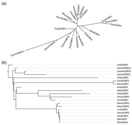 The codling moth, Cydia pomonella (L.) (Lepidoptera: Tortricidae), is a major pest of apples and pears, as well as other seed and stone fruits, which causes huge economic losses globally. Host plant volatiles and sex pheromones have been well applied to control C. pomonella, due to the strong chemosensory ability of C. pomonella. Previous studies identified 85 odorant receptors (ORs) and 40 odorant-binding proteins (OBPs) in C. pomonella [23]. Notably, the CpomOR3 and CpomGOBP2 genes have been duplicated over the course of the long-term evolution in C. pomonella. Studies have confirmed that the copies of CpomOR3 enhanced the capabilities of mate location and host plant recognition. Using genome and transcriptome analysis, scientists determined that the CpomGOBP2 genes have been duplicated twice, named CpomGOBP2a, CpomGOBP2b, and CpomGOBP2c [24,25]. However, the functions of these three CpomGOBP2 genes remained unclear.