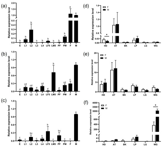 Relative mRNA expression of CpomGOBP2 in Cydia pomonella. (a) Tissue expression profile of CpomGOBP2a; (b) tissue expression profile of CpomGOBP2b; (c) tissue expression profile of CpomGOBP2c; (d) spatiotemporal expression profile of CpomGOBP2a; (e) spatiotemporal expression profile of CpomGOBP2b; (f) spatiotemporal expression profile of CpomGOBP2c. E: egg, L1: 1st instar larvae, L2: 2nd instar larvae, L3: 3rd instar larvae, L4: 4th instar larvae, LF5: 5th instar female larvae, LM5: 5th instar male larvae, PF: female pupa, PM: male pupa, F: female adult, M: male adult, HD: head, AT: antenna, BK: beak, LP: labipalp; LG: leg, WG: wing. All values are reported as the mean + SEM and normalized. Different letters mean the significant difference between different treated proteins (p < 0.05, ANOVA, Tukey’s HSD). * p < 0.05.