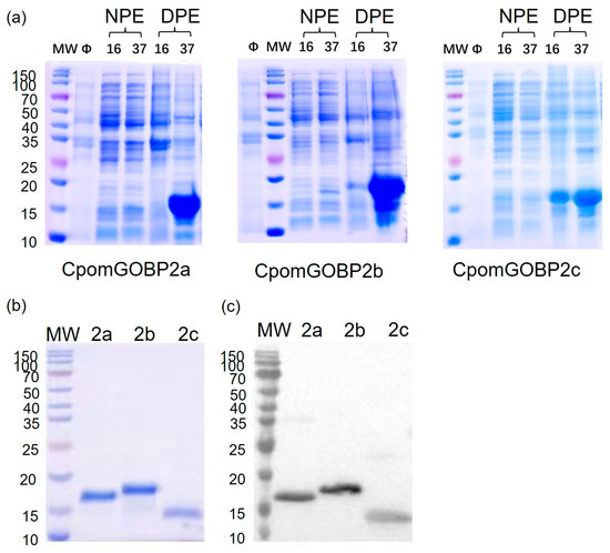 Expression and purification of three CpomGOBP2 proteins: (a) the recombinant proteins were identified as being present in inclusion bodies. Protein molecular weight marker (M), from the top: 150, 100, 70, 50, 40, 35, 25, 20, 15, 10 kDa. NPE: supernatant, DPE: inclusion bodies, Ø: negative control. (b) The purification of CpomGOBP2 proteins. (c) The Western blot of CpomGOBP2 proteins.