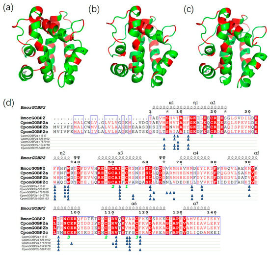 3D structures of the three CpomGOBP2 proteins and their key amino acid sites interacting with their ligands. (a) CpomGOBP2a. (b) CpomGOBP2b. (c) CpomGOBP2c. The α1-α7 are α-helixes. The red sites in the structures are the conserved sites of the three CpomGOBP2 genes. The green sites in the structures are not conserved. (d) Key amino acid sites of CpomGOBP2a and CpomGOBP2b with their ligands. The blue triangles show the interaction sites. The green numbers “1”, “2” and “3” indicated the cysteine residues forming the three disulfide bonds. The loop with alternative conformations is indicated with grey stars above. The ligands are represented by the CID number: 11517 represents butyl octanoate, 5281162 represents ethyl (2E,4Z)-deca-2,4-dienoate (pear ester), 1787910 represents codlemone, and 1549778 represents geranylaceton.