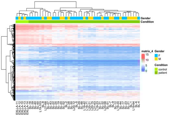 A supervised hierarchical cluster analysis was performed to compare the gene expression between patients with ALL and the healthy controls. We found 871 DEGs ((FC > 2 or <−2, p value < 0.05, FDR < 0.05), of which 781 (95.1%) were coding genes, and the remaining 90 genes were non-coding RNAs. Within the coding genes, 125 were up-regulated, and 656 were down-regulated in cases compared to healthy subjects (Figure 1). The top ten up-regulated genes included DNTT, MYB, SOX4, EBF1, ERG, FLT3, CD34, STMN1, CDK6, and NAV1, while the most down-regulated genes were PTGS2, PPBP, ADGRE3, LUCAT1, VCAN, TUBB1, PF4, RGS2, SH3BGRL2, and CLEC7A (Table 2).