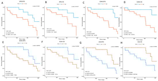 OS analysis was performed for the top ten up-regulated and top ten down-regulated genes, revealing that ERG, SOX4, and CDK6 were associated with a worse prognosis. The associations between the expression (high or low, according to the median of their expression level) and EFS and OS revealed significant differences in hazard ratios (HRs) (Figure 3A–F). For instance, the high expression of ERG (HR = 3.33, 95% CI 1.19–9.34, p < 0.021 and HR = 4.24, 95% CI 1.51–15.63, p < 0.02) and CDK6 (HR = 5.33, 95% CI = 1.55–18.35, p < 0.007 and HR = 5.6, 95% CI = 1.25–25.44, p < 0.024) showed high risk of relapse and death, respectively (Figure 3A–D). Meanwhile, SOX4 expression was associated with EFS (HR = 2.92 95% CI = 1.068–7.99, p < 0.036) but not with OS (HR = 3.37 95% CI = 0.939–12.14, p < 0.62) (Figure 3E,F). Genes such as STMN1 and CD34 were associated either with EFS or OS, respectively. Regarding the hub genes, low expression of CD4 was associated with better outcomes (HR = 0.3 95% CI = 0.115–0.79, p < 0.0147 and HR = 0.27 95% CI = 0.08–0.87, p < 0.089 for EFS and OS, respectively) (Figure 3G,H).