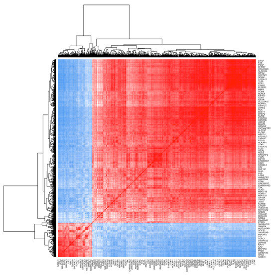 Heat map of the gene co-expression network. The heatmap describes the correlation among gene expression. Each row and column of the heatmap corresponds to a single gene. Blue: low correlation; red: high correlation. Color intensity reflects the level of gene correlation.