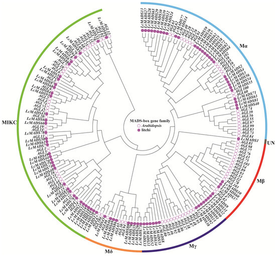 To clarify the evolutionary relationship of MADS-box genes in litchi and Arabidopsis, a phylogenetic tree was constructed based on 94 LcMADS-box proteins and 93 AtMADS-box proteins (Figure 1 and Table S2). According to the classification method of the AtMADS-box family [3], all of these 187 MADS-box genes were grouped into six subgroups (Mα, Mβ, Mγ, Mδ, MIKC, and UN) in the phylogenetic tree. In the LcMADS-box gene family, subgroups Mα, Mβ, Mγ, Mδ, and MIKC contained 30, 6, 11, 9, and 37 members, respectively. It is notable that LcMADS1 was not classified into any of these subgroups, and therefore, it was grouped into the UN subgroup.