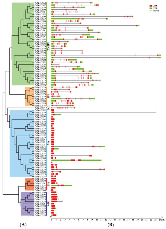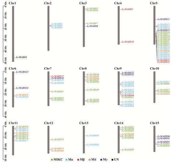The positional relation of all LcMADS-box genes on the chromosomes is shown in Figure 2. The results showed that 94 LcMADS-box genes were located on 15 different chromosomes, with an uneven distribution of LcMADS-box genes across each chromosome. Chromosome 5 contained the highest number of LcMADS-box genes (22), followed by chromosome 9 with 13 LcMADS-box genes, while chromosome 1 contained the lowest number of LcMADS-box genes (1). Overall, there was no positive correlation between chromosome size and the chromosome that contained the number of LcMADS-box genes. Moreover, most of the LcMADS-box genes contained on a chromosome were grouped into different subfamilies in the phylogenetic relationships within species, revealing that different LcMADS-box genes contained on a chromosome may exercise different functions.