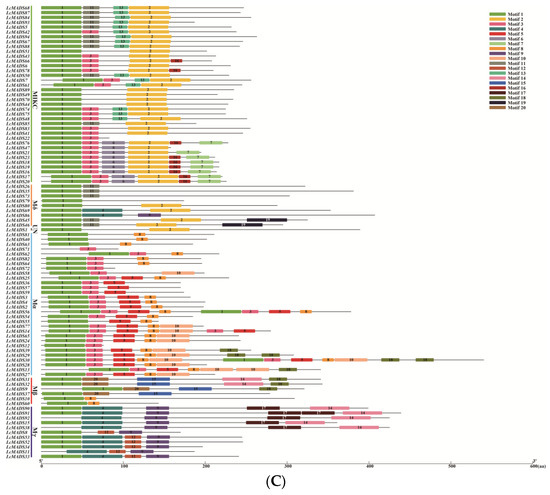 To gain insights into the structural characteristics of LcMADS-box gene family members, we analyzed the conserved motifs according to their phylogenetic relationships. As shown in Figure 4C, a total of 20 conservative motifs were predicted and named from Motif 1 to Motif 20 (Table S6). Among them, Motif 1, Motif 3, and Motif 4 were the MADS domain, and Motif 2 was the K-box domain. The MADS domains were detected in all 94 LcMADS-box genes. Motif 6, Motif 7, Motif 13, and Motif 16 were unique to the members of group MIKC, and they only existed in some of the MIKC members; Motif 9 was unique to the two members of group Mδ; Motif 5 and Motif 10 were unique to Mα; Motif 15 and Motif 20 were unique to Mβ; Motif 12 and Motif 17 were unique to Mγ. MIKC and Mδ shared two similar motifs (Motif 2 and Motif 11); Mδ and Mγ shared two similar motifs (Motif 4 and Motif 9); Mα and Mβ shared two similar motifs (Motif 8 and Motif 18); while Mβ and Mγ only shared one motif (Motif 14). Moreover, all MIKC members had Motif 1, while all Mγ members had Motif 9.