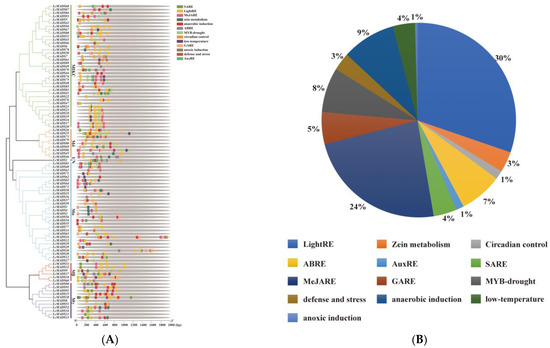 The cis-regulatory elements in the promoter region of LcMADS-box gene family members (A) and their proportions (B). SARE (salicylic acid response element), LightRE (Light response element), MeJARE (methyl jasmonate response element), ABRE (ABA response element), GARE (gibberellin response element), and AuxRE (auxin response element).