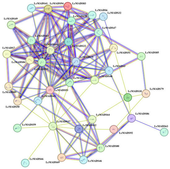 Protein–Protein interaction (PPI) networks are made up of different proteins that may interact with each other to participate in various aspects of life processes, including biological signal transduction, gene expression regulation, energy and material metabolism, and cell cycle regulation. The STRING database (https://cn.string-db.org/, accessed on 5 May 2023) was used to generate an interaction network model of the LcMADS-box proteins. The species parameter was set to Arabidopsis, and the species confidence was 0.40.