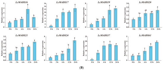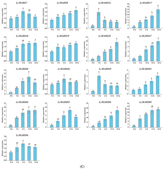 The expression profiles of selected LcMADS-box gene family members in response to different abiotic stresses. Plants were subjected to cold (4.0 ± 1.0 °C), heat (38.0 ± 0.5 °C), and drought stresses (20% (w/v) PEG6000) for 0, 3, 6, 12, and 24 h. Error bars represent the standard deviation of the mean. (A) LT; (B) HT; (C) PEG. Different letters indicate significant differences, and the same letters represent no significant differences at the 0.05 level.