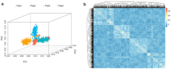 Multi-parent population structure analysis with 6616 SNPs. (a) Principal component analysis; red dots represent Pop1 (RIL-CML312), yellow dots represent Pop2 (RIL-CML373), blue dots represent Pop3 (RIL-CML444), and teal dots represent Pop4 (RIL-YML46). (b) Kinship analysis for 642 maize F8 RILs.