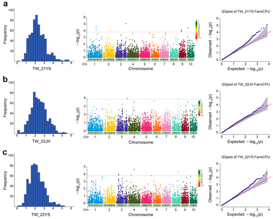 Phenotypic distribution, Manhattan, and QQ plots of genome-wide association study for TW in Yanshan in 2021 (a), Jinghong in 2022 (b), and Yanshan in 2022 (c). Manhattan plot: the dashed red line indicates the significance level. QQ plot: the red line indicates the expected significance value.