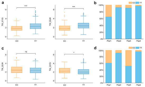 Phenotypic difference of different alleles of the co-localized SNPs. (a) Phenotypic difference of alleles at SNP S3_226041015 in the 21YS and 22JH environments, with *** indicating p < 0.001; (b) proportion of two alleles at SNP S3_226041015 observed in each subpopulation of the multi-parent population; (c) phenotypic difference of alleles at SNP S8_137379725 in the 22JH and 22YS environments, with ns indicating not significant and * indicating p < 0.05; (d) proportion of two alleles at SNP S8_137379725 observed in each subpopulation of the multi-parent population.