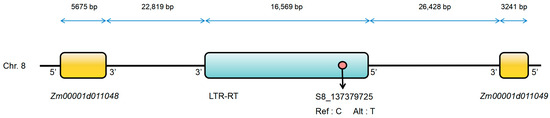 Relative positions of the significant SNP, LTR-RT, and candidate genes. Yellow boxes indicate candidate genes Zm00001d011048 and Zm00001d011049. The blue box indicates the LTR-RT. The pink circle indicates the significant SNP, S8_137379725.