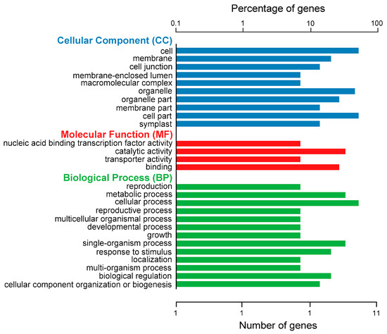 GO enrichment classification statistics chart. Blue bars indicate GO terms within the cellular component category. Red bars indicate GO terms related to the molecular function category. Green bars represent GO terms associated with biological processes.