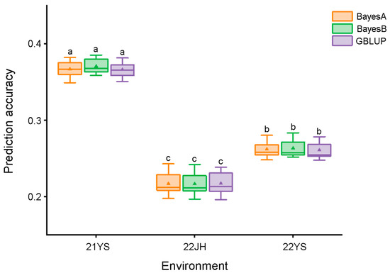 Prediction accuracy of TW in the multi-parent population across different environments using three models. The triangles indicate average prediction accuracy. The letters ‘a’, ‘b’, and ‘c’ denote statistically significant differences between models at the α = 0.05 level in the respective environments.