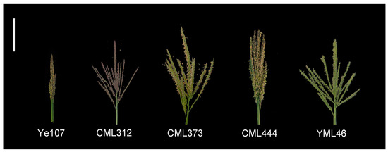Comparison of tassel size in parental lines of multi-parent population three days after pollination. Bar, 10 cm.