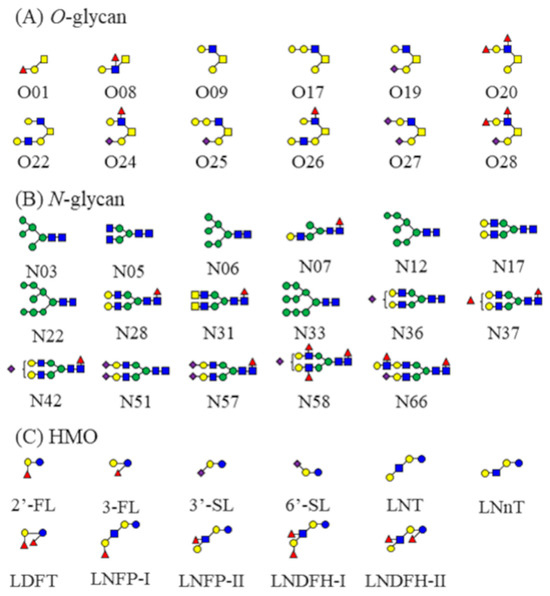 The absolute concentrations of the 11 representative HMOs in the same 200 samples of human milk were measured using HPAE-PAD to compare the concentration distribution of N/O-glycans with that of HMOs (Tables S1 and S2). Each concentration range was consistent with previously reported values [34,35]. The CV of each HMO was 43–114% (Figure S3). Comparing the CVs of N/O-glycans with those of HMOs, the concentrations of both N/O-glycans in human milk had a more significant distribution among individuals than those of HMOs.