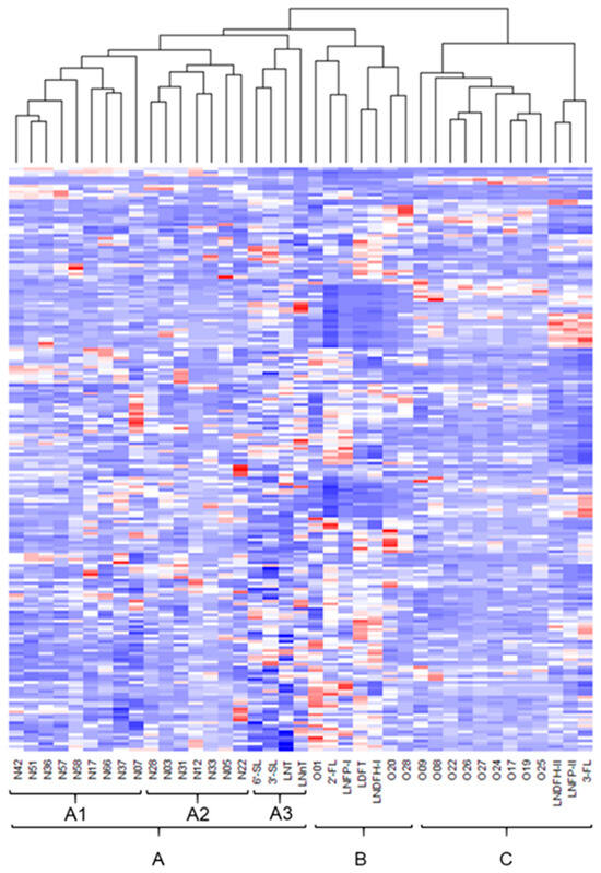 Heatmap of the relative concentration of N- and O-glycans and HMOs (columns) in 200 samples of human milk (rows) with dendrogram. The relative concentration of each glycan was standardized to a mean of 0 and a standard deviation of 1. Colors range from blue (minimum relative concentration) to red (maximum relative concentration) and white represents the mean value. The letters below the heatmap correspond to each glycan in Figure 2. The lower letters represent the main groups (A, B, C) and subgroups (A1, A2, A3) classified by the dendrogram.